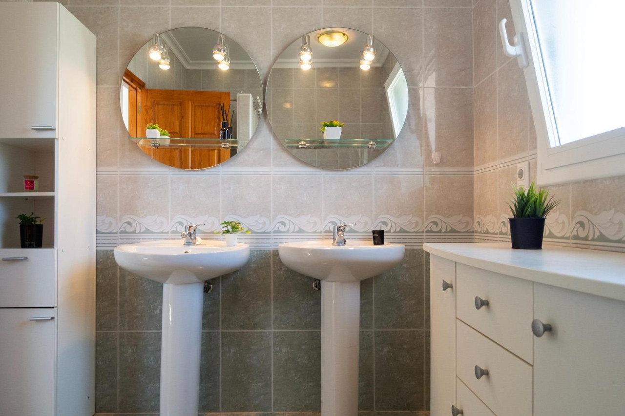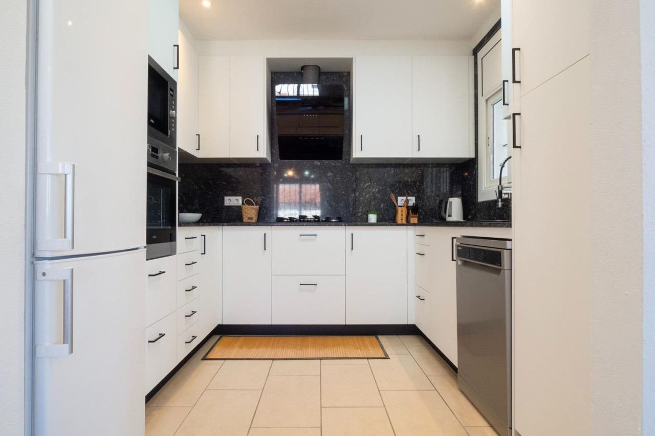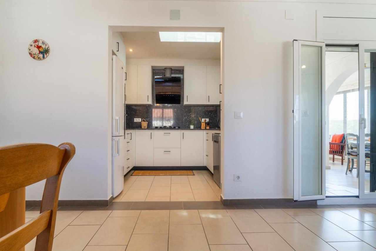 En la planta baja, encontramos un amplio salón-comedor con chimenea y con acceso directo a una veranda, donde podrás disfrutar de las vistas laterales al mar mientras te relajas. La cocina, totalmente reformada hace solo un año, está equipada para satisfacer las necesidades más exigentes. También dispone de dos habitaciones dobles y dos baños completos. El garaje, con acceso directo al interior de la casa, añade comodidad al día a día.
